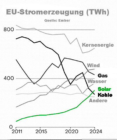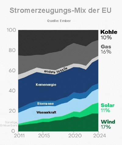 Während die EU-Stromerzeugung mit Gas seit 2019 kontinuierlich zurückging, erlebte die Kohle durch die Energiekrise der Jahre 2021/22 einen zeitweiligen Aufschwung. Das lag vor allem an der Reaktivierung von Kohlekraftwerken in Deutschland, um die zeitweilig extrem verteuerte Stromerzeugung mit Gas so weit wie möglich zu ersetzen. |