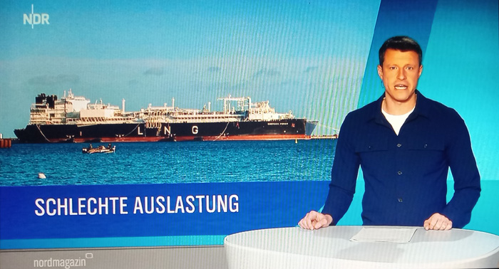 Der NDR berichtete wiederholt über die schlechte Auslastung des LNG-Terminals Mukran: Im Hintergrund ist das FSRU-Schiff "Energos Power" zu sehen, das der Betreiber vom Bundeswirtschaftsministerium für zehn Jahre gemietet hat und nun vorzeitig wieder loswerden möchte. |