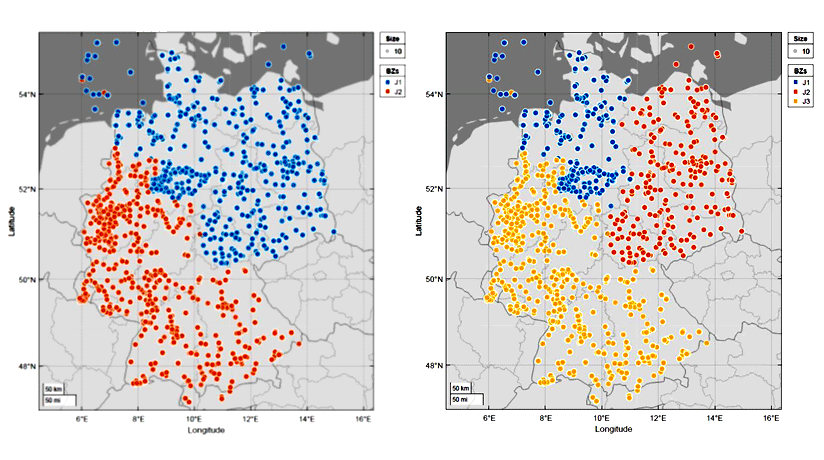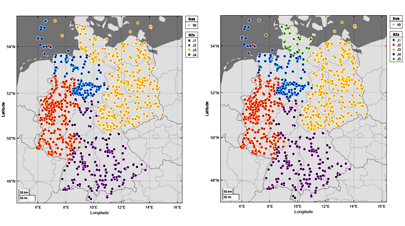 Die Überprüfung der Gebotszonen, wie sie von ACER beschlossen wurde, sah im Fall Deutschlands vor, den status quo mit vier alternativen Konfigurationen zu vergleichen. Als günstigste Lösung wurde jetzt die Konfiguration mit fünf Zonen ermittelt, die im wesentlichen mit der Vier-Zonen-Lösung übereinstimmt, aber die Region Schleswig-Holstein (grüne Punkte) zu einer eigenen Gebotszone macht. Die farbigen Punkte markieren die Netzknoten, die den jeweiligen Gebotszonen zugeordnet wurden :