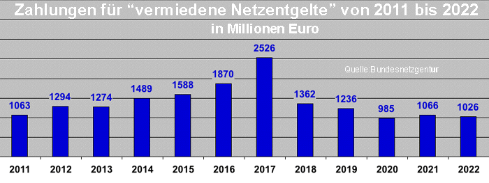 | Die Kosten der "vermiedenen Netzentgelte" stiegen unentwegt und erreichten 2017 mit 2,526 Milliarden Euro ihren Höhepunkt. Dann wirkten sich die Abstriche durch das "Netzentgeltmodernisierungsgesetz" aus, das zwar die Zahlungen für Neuanlagen ab 2023 beseitigte, für Bestandsanlagen aber auf dem Stand des Jahres 2016 weiterhin gewährte. Deshalb müssten die Stromverbraucher noch viele Jahre lang mit einer jährlichen Belastung von rund eine Milliarde Euro rechnen, falls es nicht zu der von der Bundesnetzagentur geplanten stufenweisen Abschaffung bis 2029 kommt. |