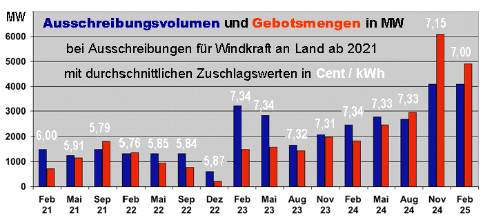 Nach den beiden vorangegangenen Auktionen im Vorjahr war auch die jüngste Ausschreibung für Windkraft an Land wieder überzeichnet, die zum 1. Februar stattgefunden hat. Wie die Bundesnetzagentur mitteilte, wurden bei einer ausgeschriebenen Menge von 4.094 Megawatt 506 Gebote mit einer Gebotsmenge von 4.896 MW eingereicht. Dabei konnten 422 Gebote mit einer Zuschlagsmenge von 4.094 MW einen Zuschlag erlangen. Sechs Gebote mussten vom Zuschlagsverfahren ausgeschlossen werden.