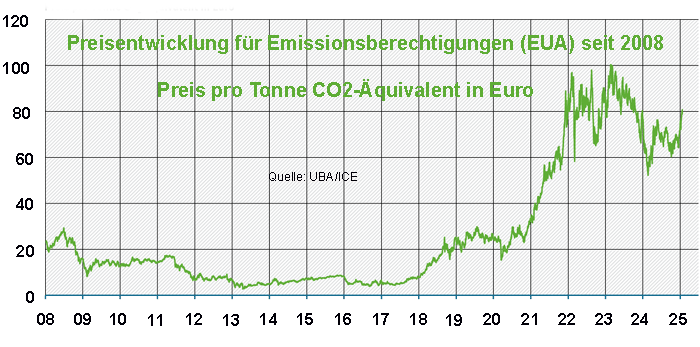 Der 2005 gestartete Handel mit Emissionszertifikaten für Kraftwerke und andere Großfeuerungsanlagen blieb bis 2018 weitgehend wirkungslos, weil ein hoher Überschuss an Zertifikaten bestand und die Emissionsberechtigungen deshalb viel zu billig waren (siehe Hintergrund, November 2017). Erst am Ende der 2013 begonnenen dritten Handelsperiode begannen allmählich die 2018 beschlossenen Reformen zu wirken, zu denen vor allem die "Marktstabilisierungsreserve" (MSR) gehört (180210). In der 2021 begonnenen vierten Handelsperiode erreichte dann der Preis für ein Zertifikat, das zur Emission einer Tonne CO2-Äquivalent berechtigt, sogar bis an die 100 Euro. Ende Juli lag er bei etwas über 70 Euro. Die vierte Handelsperiode geht bis 2030. Sie umfasst zwei Zuteilungsperioden, deren erste zum Ende dieses Jahres ausläuft. |