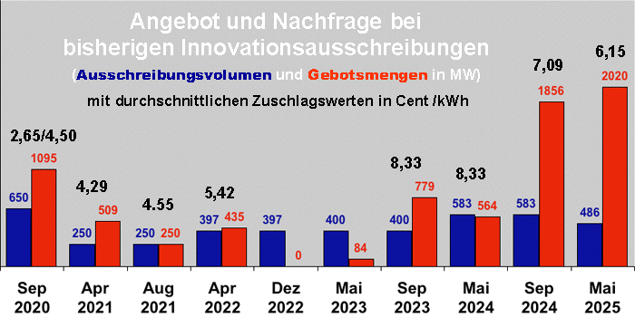 Die "Innovationsausschreibungen" haben 2020 die früheren "technologieneutralen" Ausschreibungen abgelöst, die theoretisch sowohl Wind- als auch Solarprojekte umfassten, aber in der Praxis ebenfalls auf Solarprojekte hinausliefen. Schon bei der ersten Innovationsausschreibung befand sich unter den Zuschlägen nur ein einziges Windkraftprojekt (201015). Seit der zweiten Auktion kann gemäß der Ausführungsverordnung nur noch für Anlagenkombinationen geboten werden (bei denen mehrere EE-Anlagen oder Speicher über denselben Netzverknüpfungspunkt einspeisen). Im übrigen sind grundsätzlich alle erneuerbaren Stromerzeugungstechnologien zugelassen. Im Ergebnis wurden bisher aber ausschließlich Gebote für Anlagenkombinationen von Solaranlagen mit Speichern abgegeben (210513).
