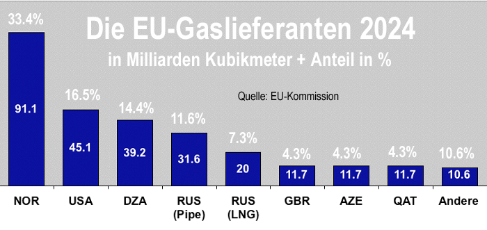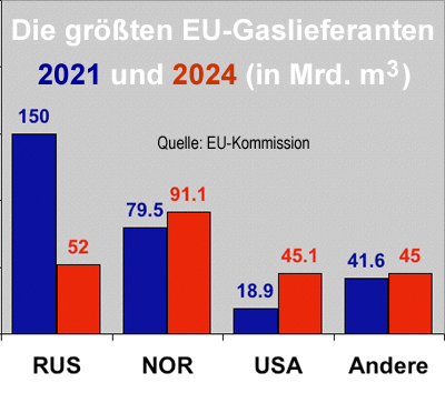 Norwegen ist infolge des russischen Eroberungskriegs gegen die Ukraine zum wichtigsten Erdgas-Lieferanten der EU geworden. Im vergangenen Jahr rangierte Russland aber mit einem Anteil von insgesamt fast19 Prozent noch immer an zweiter Stelle, gefolgt von USA, Algerien, Großbritannien, Aserbaidschan und Katar. In dieser Grafik wird bei den russischen EU-Importen zwischen Pipeline- und LNG-Lieferungen unterschieden. Deshalb sieht die Reihenfolge der Länder-Balken etwas anders aus. Wenn die jetzt vereinbarte REPowerEU-Verordnung 2026 in Kraft tritt und tatsächlich im erhofften Maße wirksam wird, gibt es ab 2028 überhaupt keine EU-Gasimporte aus Russland mehr. Für den Kreml würde das den Verlust vieler Milliarden bedeuten, mit denen er bisher seinen mörderischen Krieg in der Ukraine finanzieren kann. |