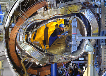 | Wie aus der Schrottpresse: So sieht der Torus des 2014 fertiggestellten "Stellarators" Wendelstein 7-X aus, in dem das Plasma von Magnetfeldern in der Schwebe gehalten wird. Die gequetschte Form ist das Ergebnis ausgefeilter Berechnungen zur Erzeugung eines besonders stabilen und wärmeisolierenden magnetischen Käfigs. | Schön symmetrisch: Beim konkurrierenden Prinzip des "Tokamak" ist die Bauweise einfacher. Ein großer Nachteil gegenüber dem "Stellarator" ist aber die Instabilität des Plasmas, die nur einen pulsierenden Betrieb ermöglicht. Das Foto zeigt den ASDEX Upgrade, den das Max-Planck-Institut für Plasmaphysik in Garching seit 1991 betreibt. |