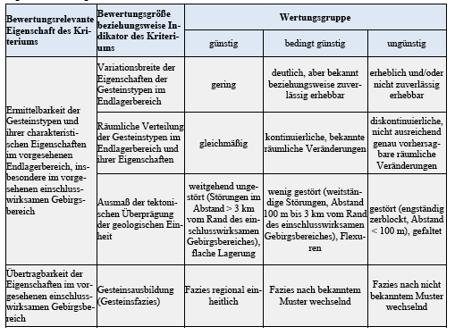 Die für die langfristige Stabilität der günstigen Verhältnisse wichtigen sicherheitsgerichteten geologischen Merkmale sollen sich in der Vergangenheit über möglichst lange Zeiträume nicht wesentlich verändert haben. Indikatoren hierfür sind insbesondere die Zeitspannen, über die sich die Betrachtungsmerkmale „Mächtigkeit“, flächenhafte beziehungsweise räumliche „Ausdehnung“ und „Gebirgsdurchlässigkeit“ des einschlusswirksamen Gebirgsbereichs nicht wesentlich verändert haben. Sie sind wie folgt zu bewerten: