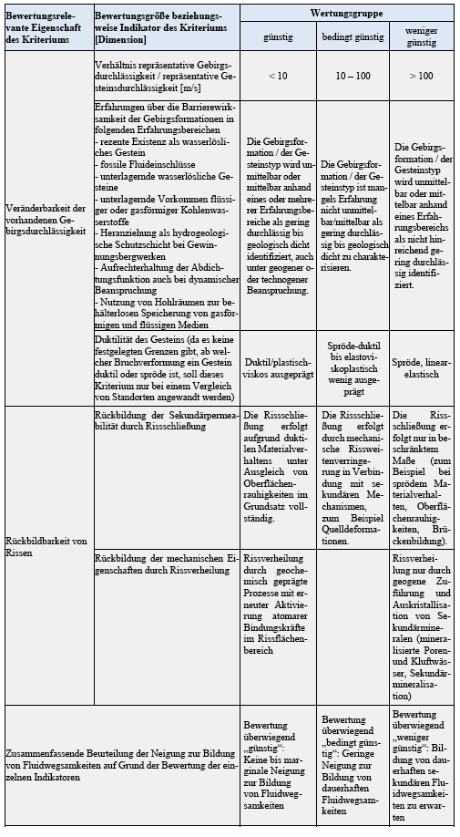 Die Neigung zur Ausbildung mechanisch induzierter Sekundärpermeabilitäten im einschlusswirksamen Gebirgsbereich soll außerhalb einer konturnahen entfestigten Auflockerungszone um die Endlagerhohlräume möglichst gering sein. Indikatoren hierfür sind:
