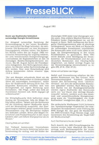"PresseBLICK" hieß diese Publikation, die seit Anfang 1990 monatlich von der "Informationszentrale der Elektrizitätswirtschaft" (IZE) an Führungskräfte der Branche verschickt wurde. Sie enthielt in knapper Form eine Rückschau auf die wichtigsten Ereignisse des vergangenen Monats inklusive ihrer Darstellung in der Presse. Als ich im Sommer 1991 bei der IZE anfing, wurde mir unter anderem die Redaktion dieses Druckerzeugnisses übertragen.